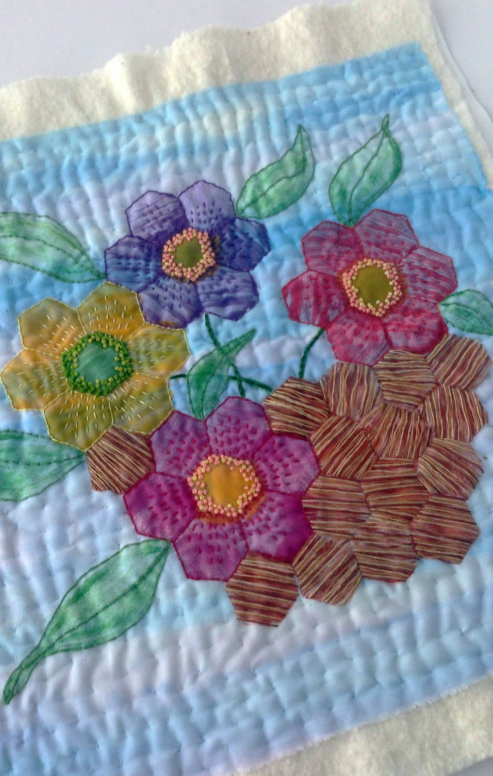 After completing a stenciled hexagon block, I was a bit stuck on what to do next because the next block was a picture block using hexagons. Naturally I wanted to do my own version and not copy the one that Amy Gibson had done for this Craftsy Block of the Month class.