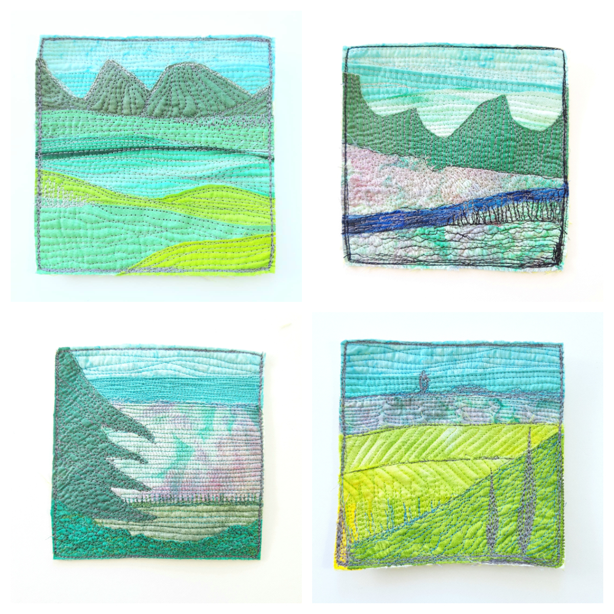 While I attempt to get myself organized after the Festival of Quilts, and try to enjoy what is left of the summer, here are a few more of my scrap busting landscapes. These have all been done with the feed dogs up. Although the photos don't show it acurately they are all the same size of roughly 5 in square.