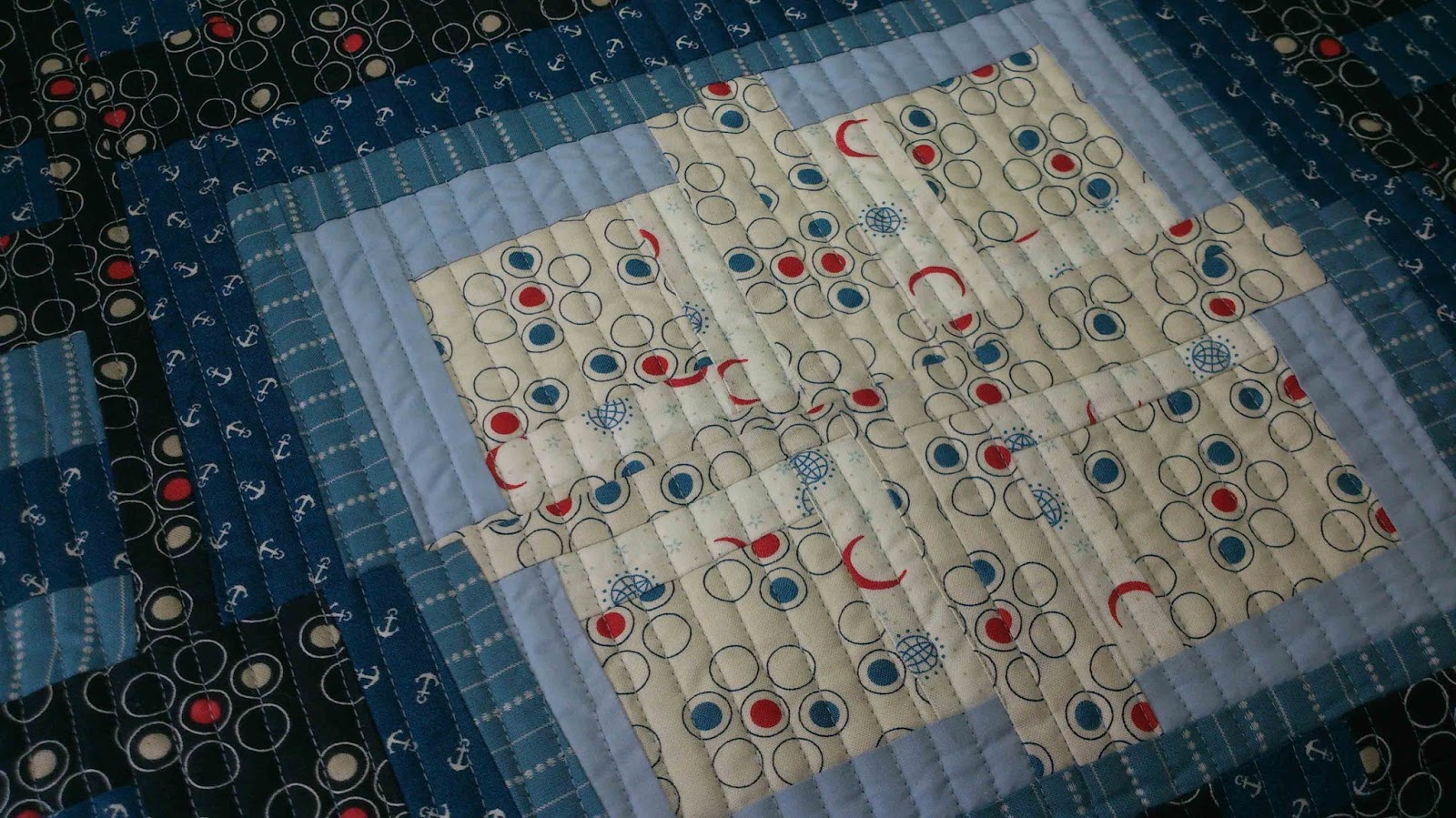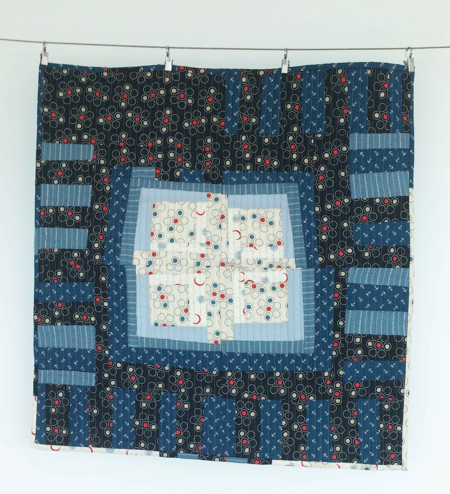 This one was put together by making four off centre log cabin type blocks. The quilting was going to be a cross hatch but once I stitched the first set of straight lines I decided that it was busy enough.