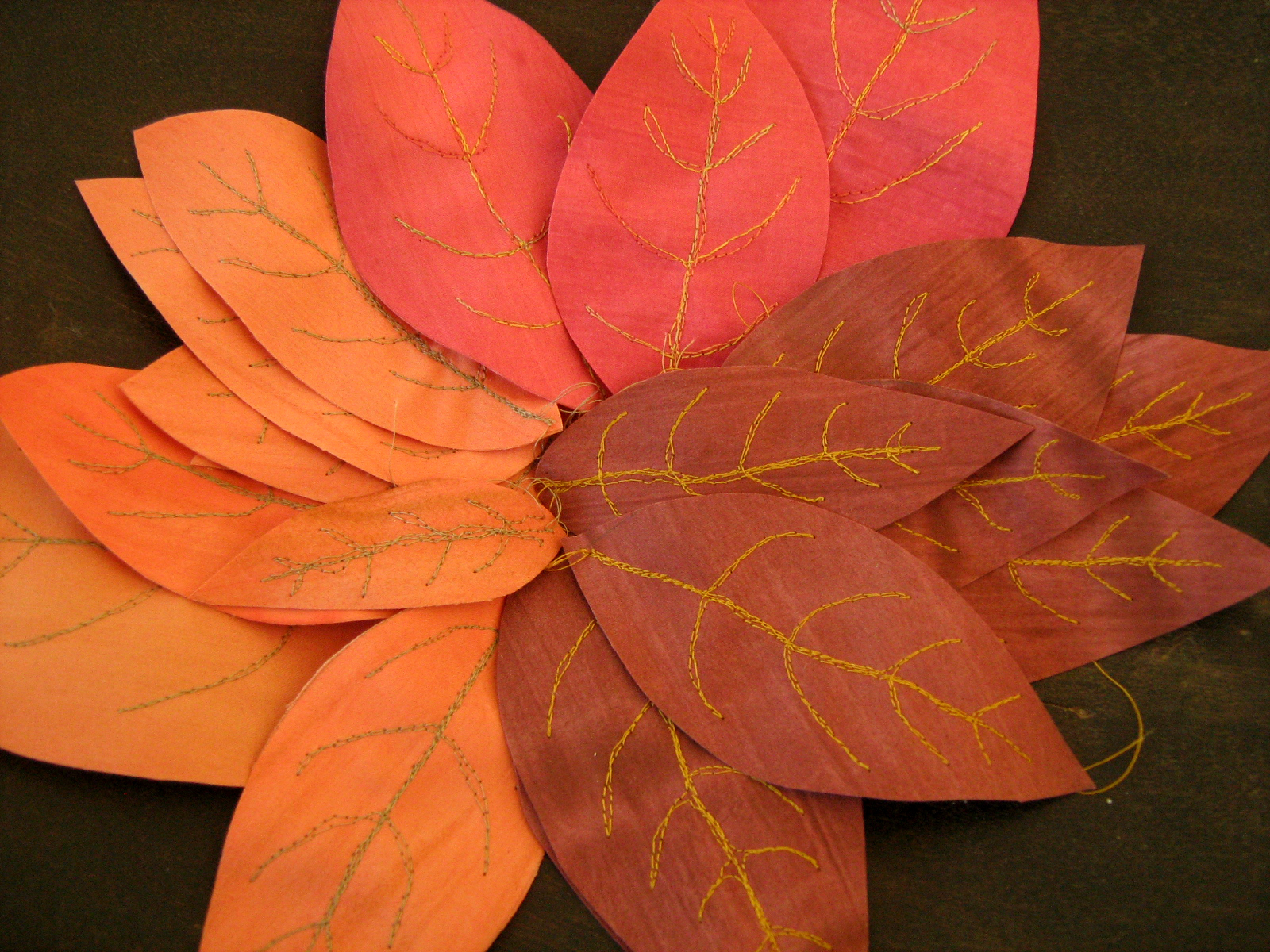 I then free machine stitched the leaf veins in contrasting threads. The webbing (I used HeatnBond Lite for these) acts as a stabiliser making the stitching simple.