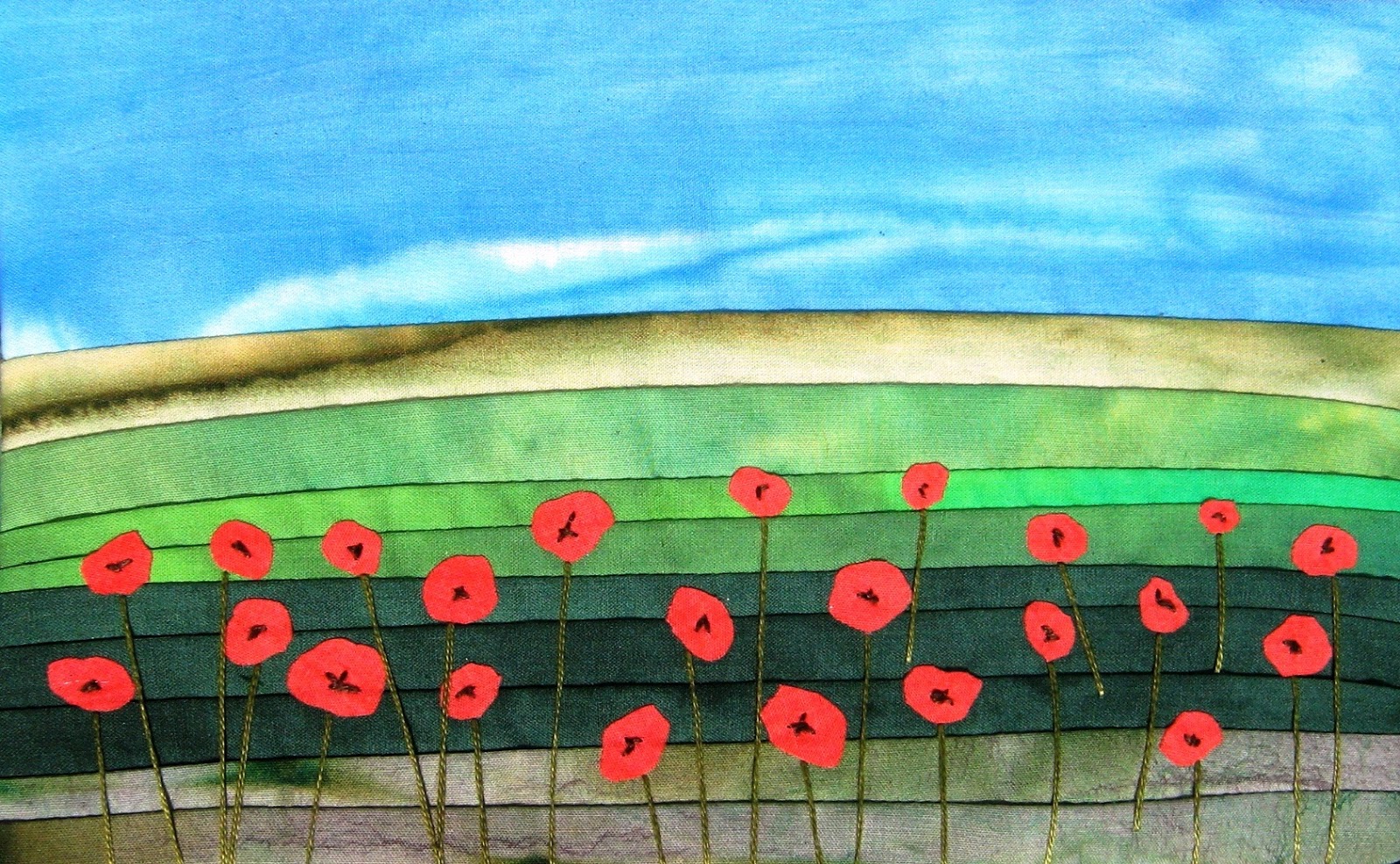 After making each one into a mini quilt sandwich, I stitched with a variety of red, black or white thread. One was done by hand before turning to the machine to speed up the process.